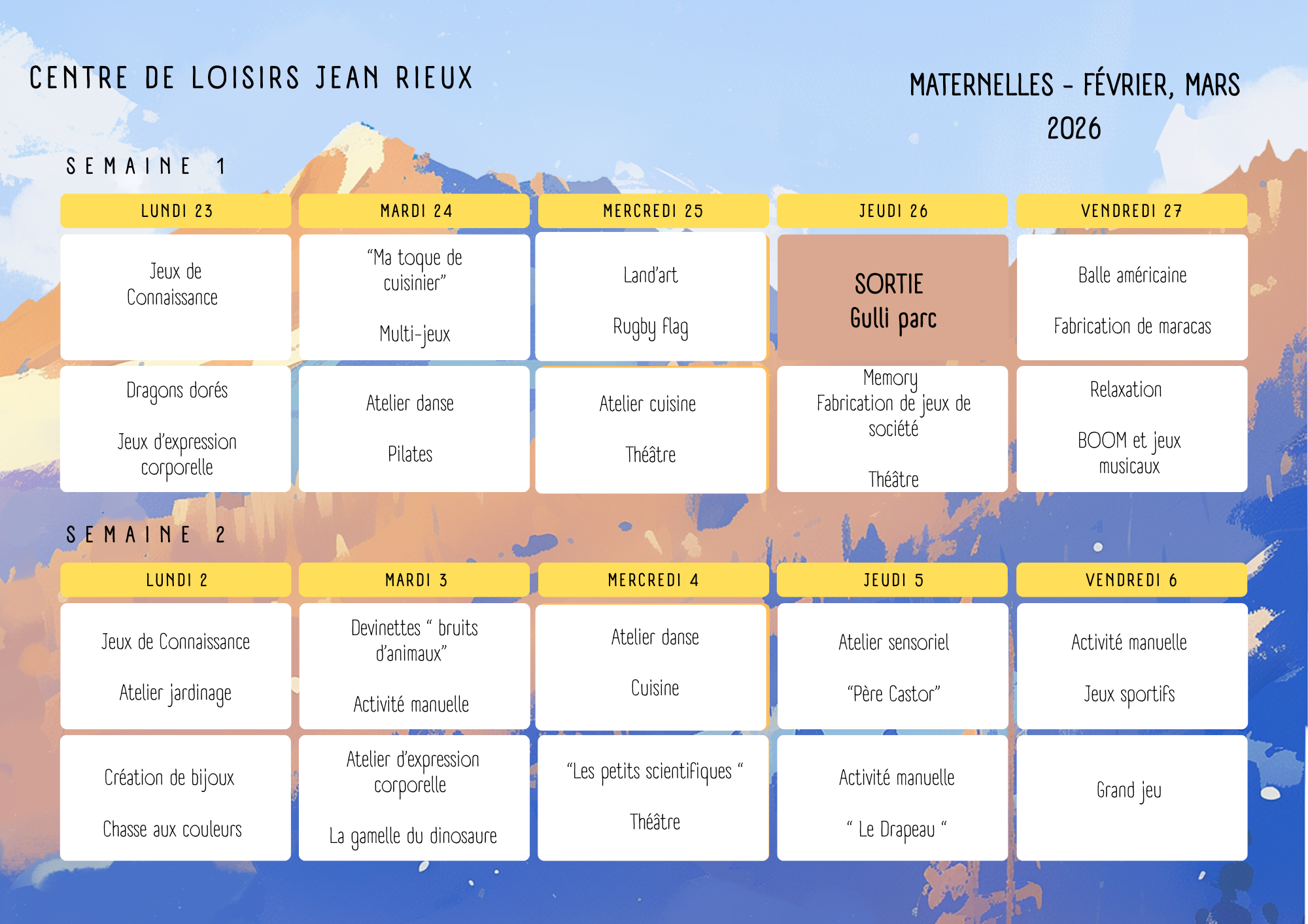 Nous accueillerons un groupe de maternelles et un groupe d'élémentaires du lundi 23 février au vendredi 6 mars 2026.