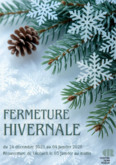 Le centre sera fermé pour congés d'hiver du 24 décembre 2025 au 4 janvier 2026 inclus.
